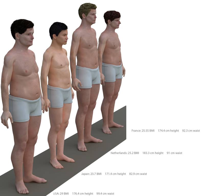 如果以美國、日本、荷蘭、法國為代表,一個位於平均水平的男性身體長下面這樣,他們的平均 BMI 值分別是 29、23.7、25.2、25.55 :