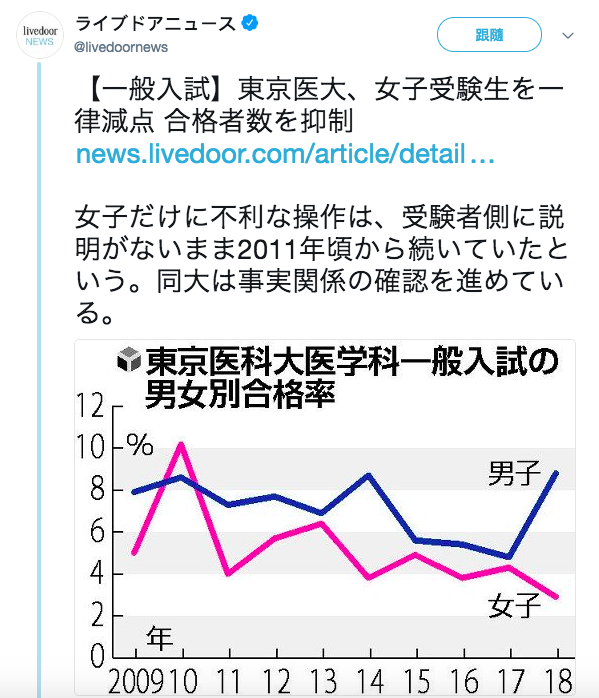 超過百年歷史的東京醫科大學,今年 7 月初因賄賂日本文科省一事爆發醜聞。為了獲得政府補助款,而與文科省利益交換,替高官小孩入學考加分。在東京地檢署持續調查下,更發現東京醫大在進行入學考時,只要是女性考生一律先被扣分。而這種不平等的作法,已於 2011 年持續至今。