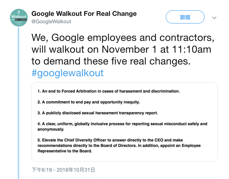 Google 員工也在此次抗議活動「為真實改變而罷工」的 Twitter 上,向公司提出五項訴求: