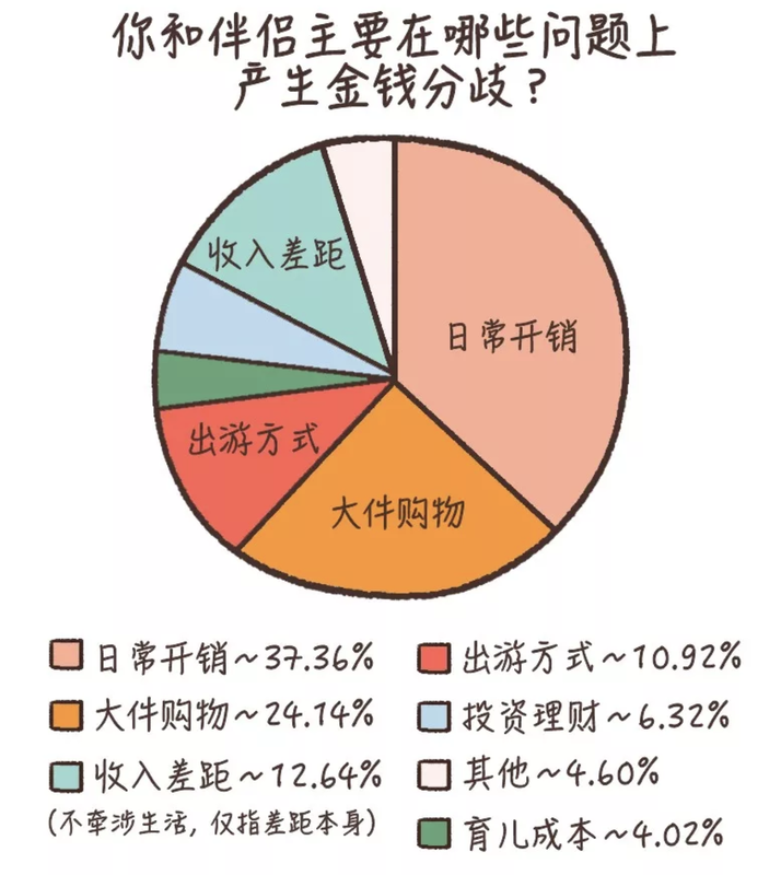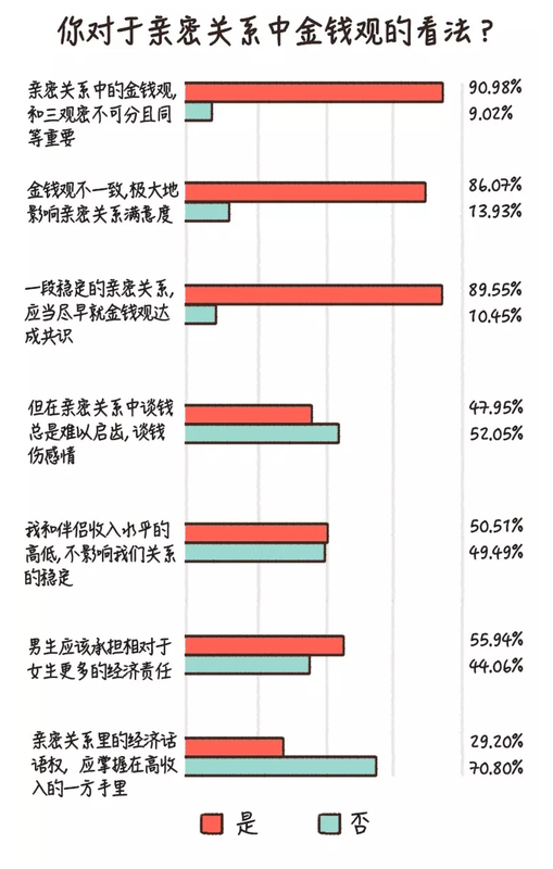 並且他們表示這些分歧的確對感情造成了相對大的影響。如果有重新選擇的機會,73.63% 的人會選擇和在金錢觀上與自己分歧較小的另一半。
